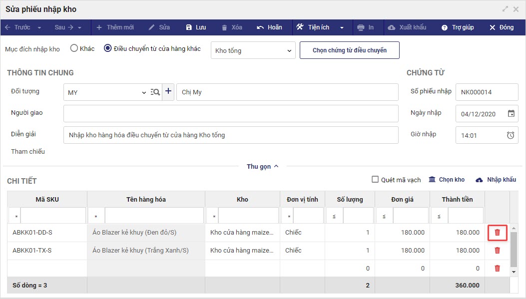 • Chọn chứng từ có phát sinh hàng hóa cần xóa. Xóa hàng hóa khỏi chứng từ.