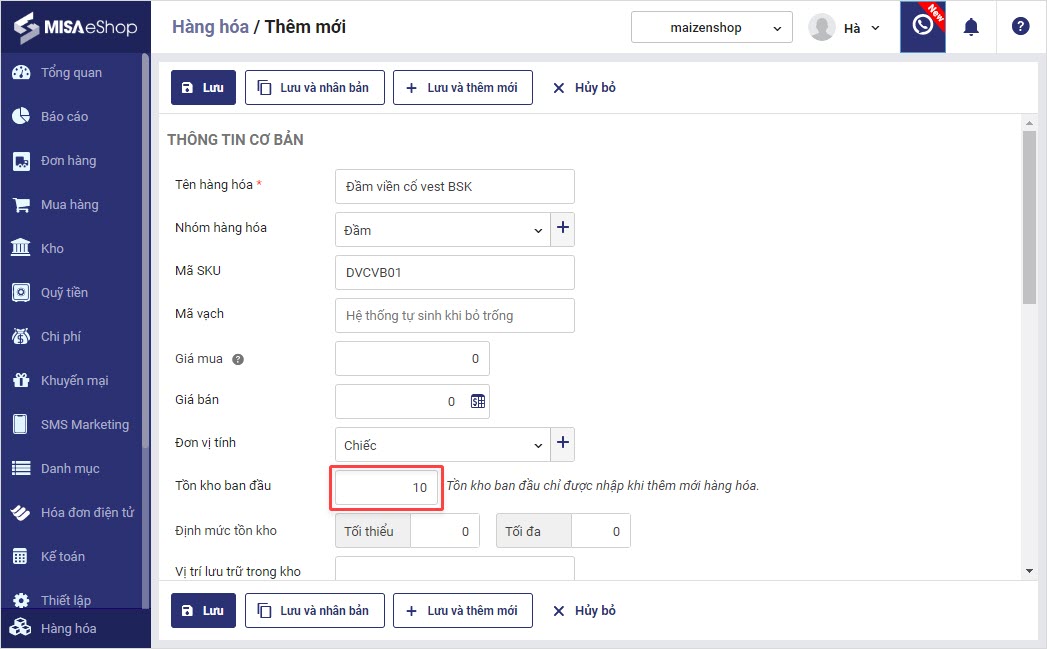 • Trường hợp khi thêm mới hàng hóa người dùng có nhập số lượng hàng hóa tồn kho ban đầu.