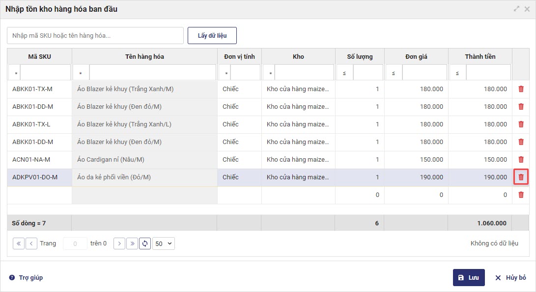 Thực hiện xóa nhập tồn kho hàng hóa ban đầu