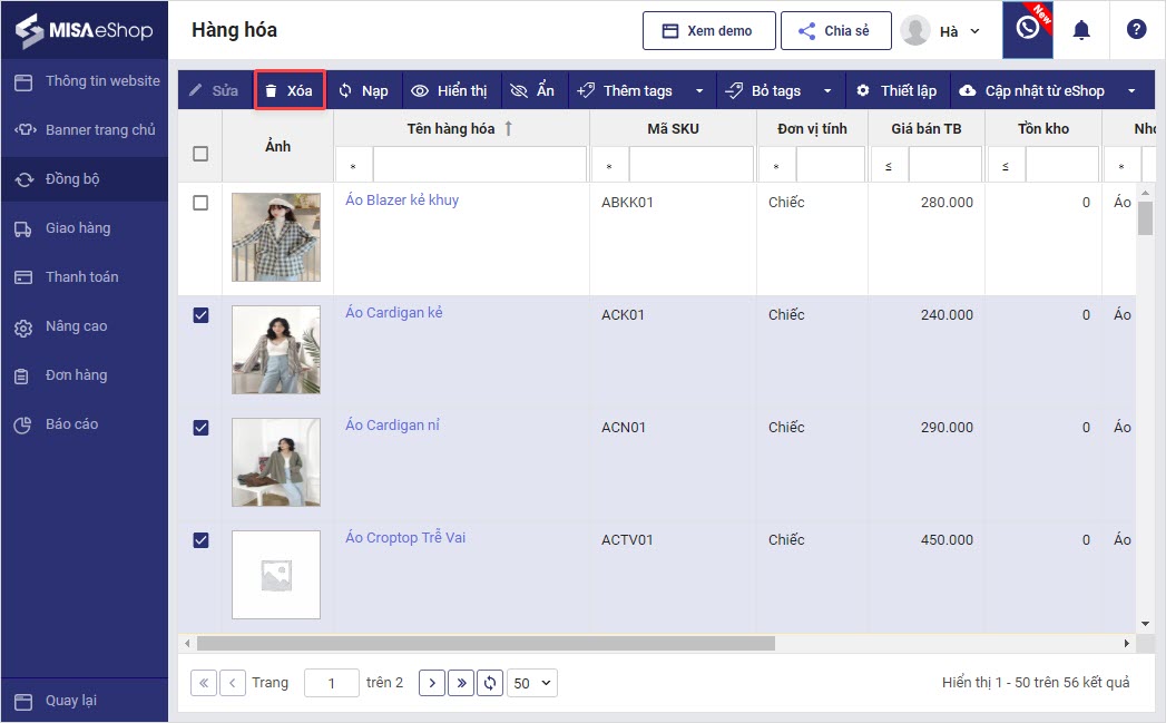 • Tích chọn hàng hóa cần xóa, nhấn Xóa.