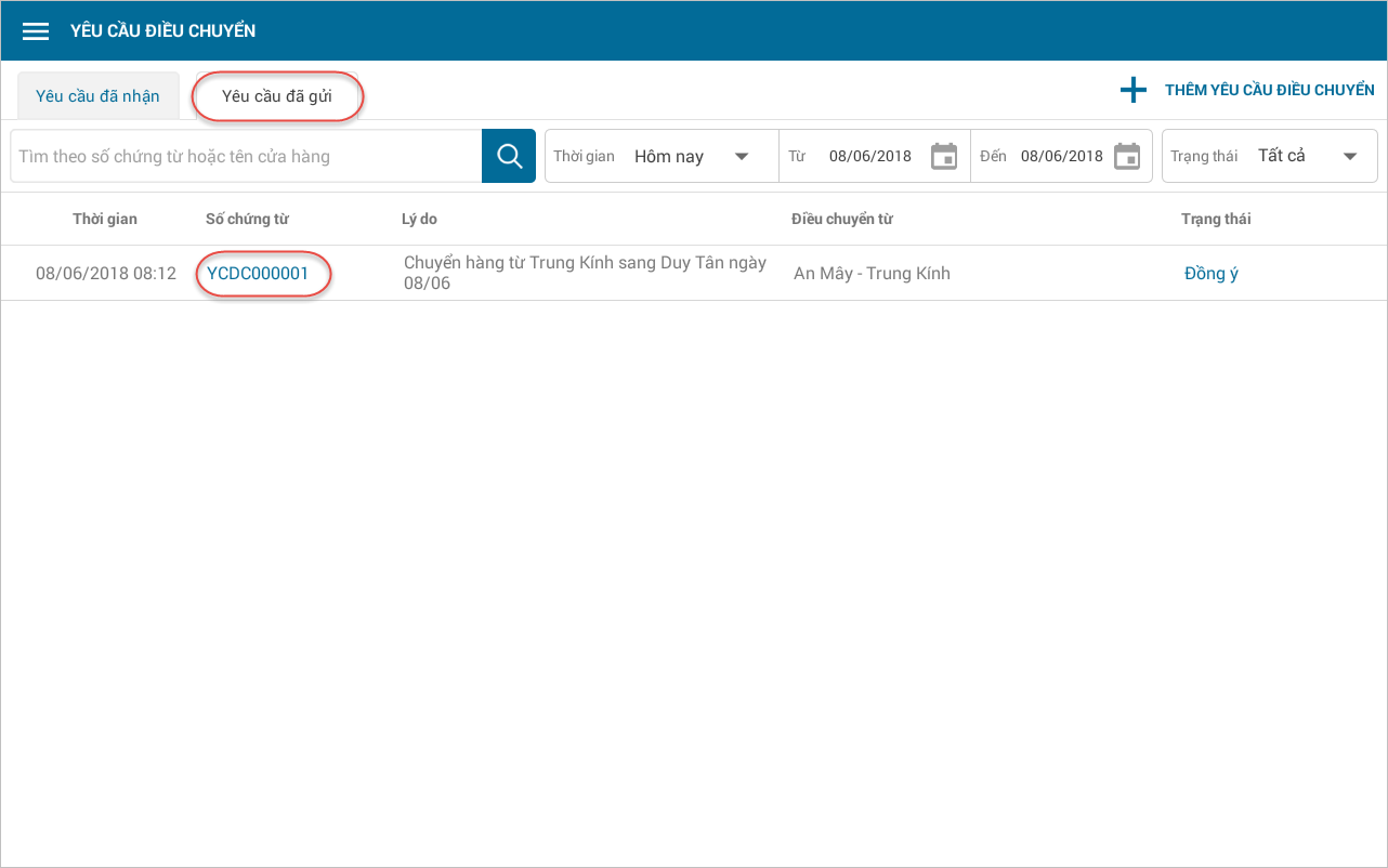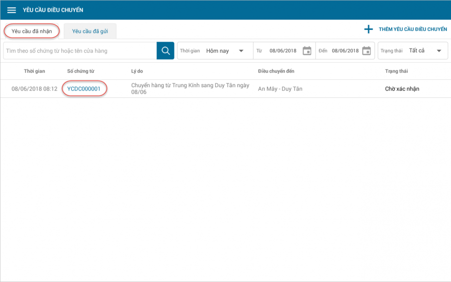, chọn Yêu cầu điều chuyển. - Tại tab Yêu cầu đã nhận, nhấn chọn yêu cầu điều chuyển từ Cửa hàng 1.