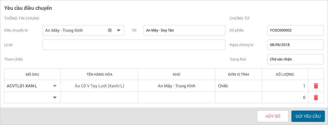 - Nhấn Gửi yêu cầu. Chương trình sẽ tự động sinh Lệnh điều chuyển trên trang web Quản lý cửa hàng 2.