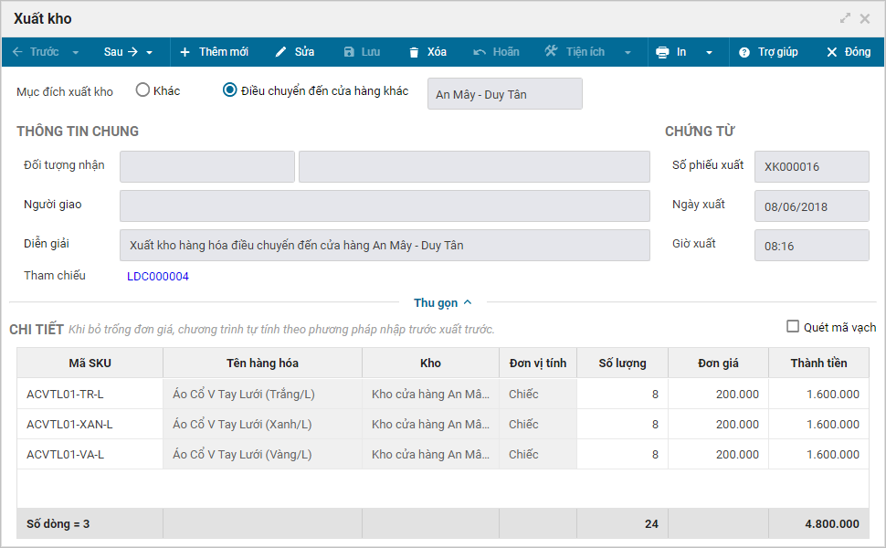 Thực tế tại một số chuỗi cửa hàng, khi khách hỏi mua hàng hóa và chi nhánh hiện tại đang hết hàng, thu ngân sẽ kiểm tra trên hệ thống xem chi nhánh nào còn hàng để chuyển về cho khách. Trước khi lấy hàng từ chi nhánh khác, thu ngân được quản lý phân quyền lập phiếu điều chuyển để xin hàng từ chi nhánh khác, thao tác thực hiện trên chương trình như sau: