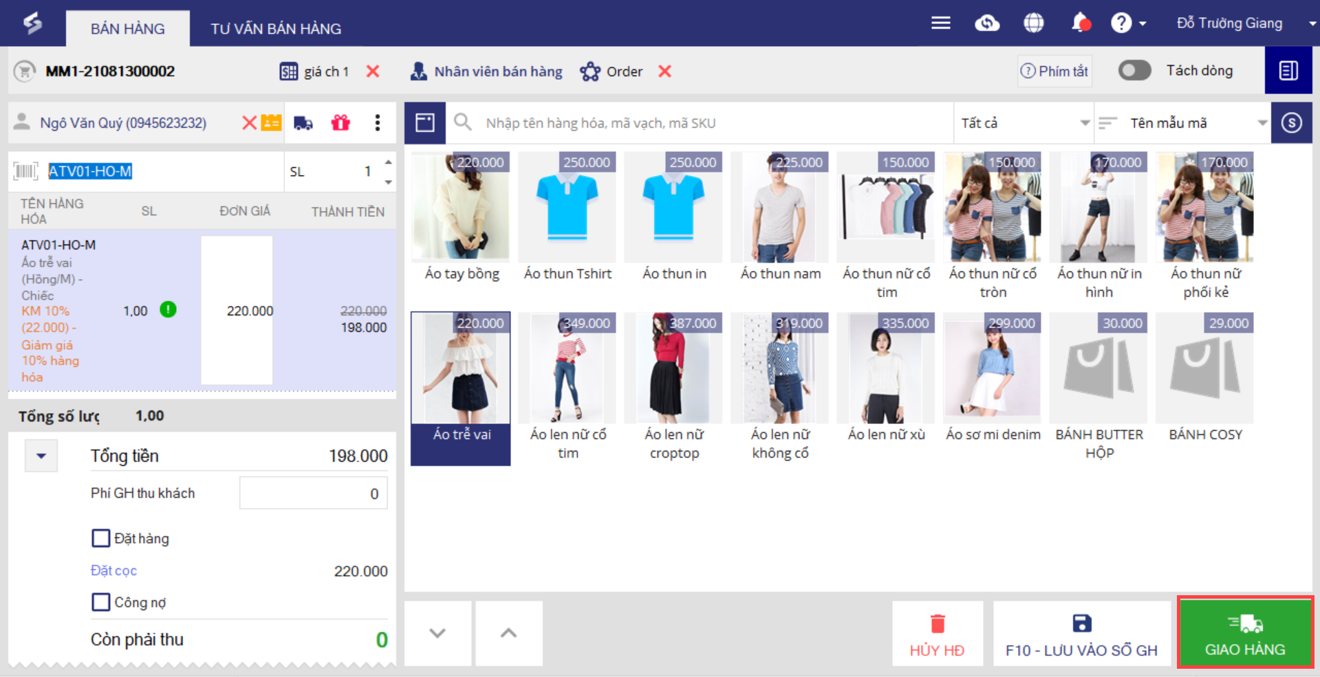 Trường hợp cửa hàng giao hàng ngay sau khi lập đơn hàng, tại màn hình Bán hàng chỉ cần thực hiện nhấn Giao hàng.