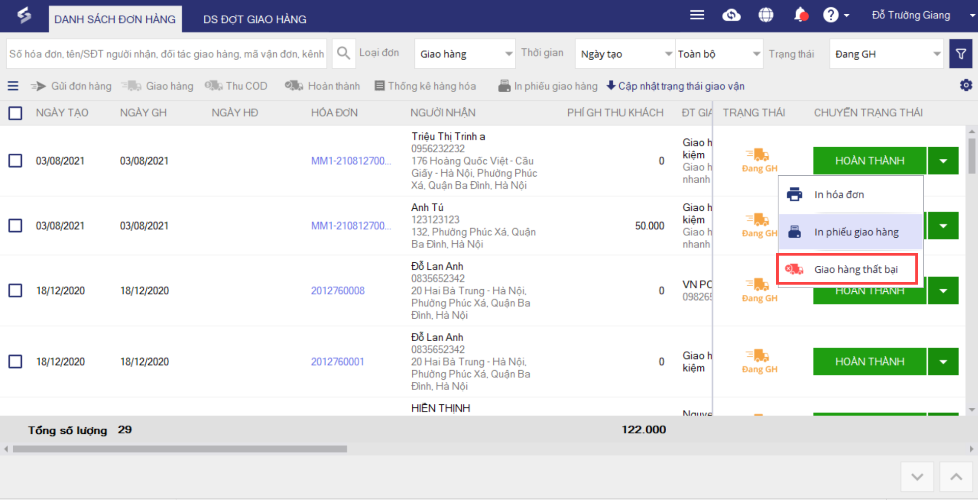 3. Nhấn Giao hàng tương ứng với đơn hàng của khách.