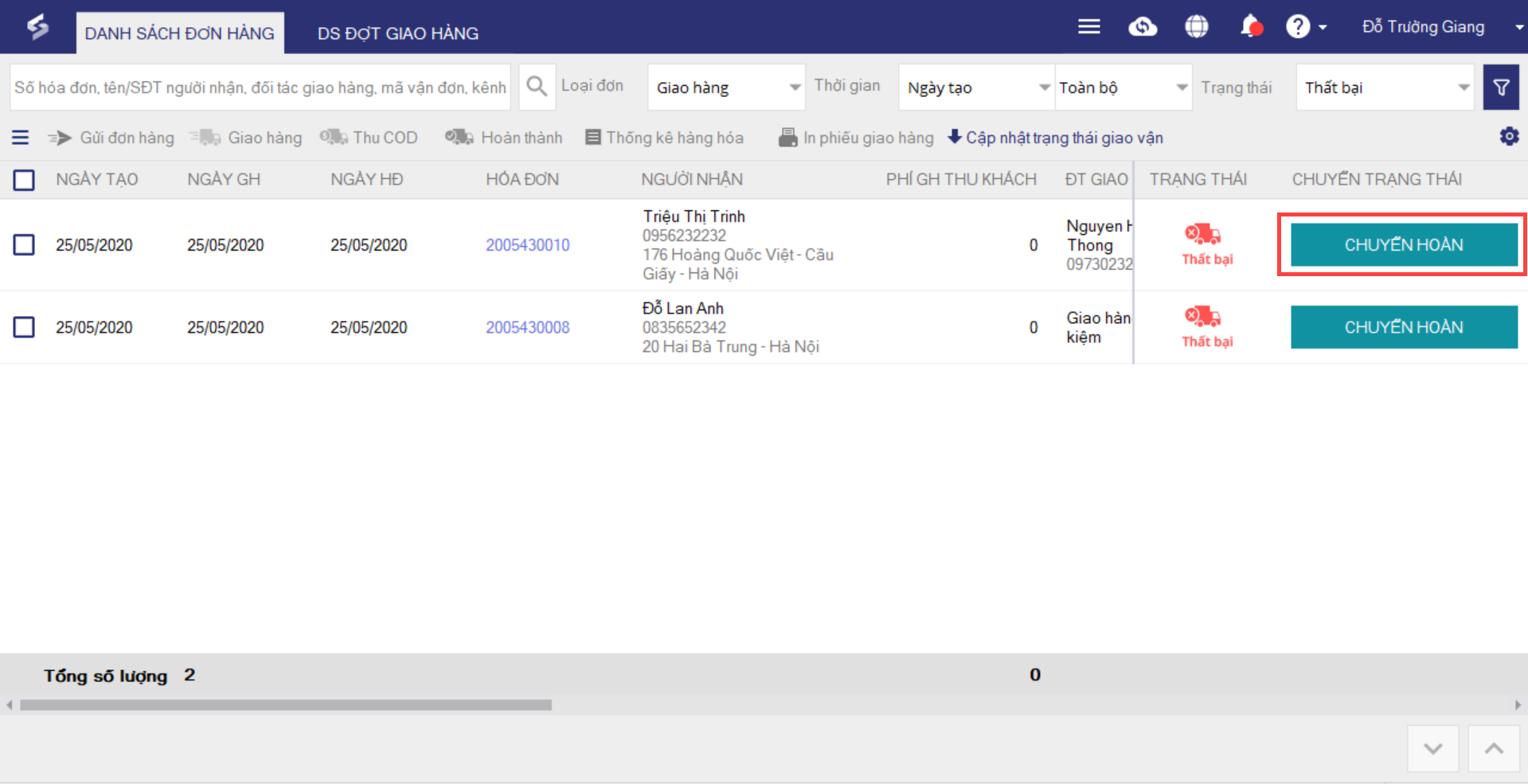 - Khi đó, đơn hàng sẽ chuyển trạng thái Thất bại, nhấn Chuyển hoàn để ghi nhận việc hoàn trả hàng hóa về kho.
