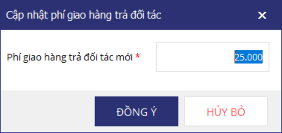 - Nếu phải trả thêm tiền cho đối tác giao hàng do giao thất bại, nhập số tiền Phí giao hàng trả đối tác mới và nhấn Đồng ý.