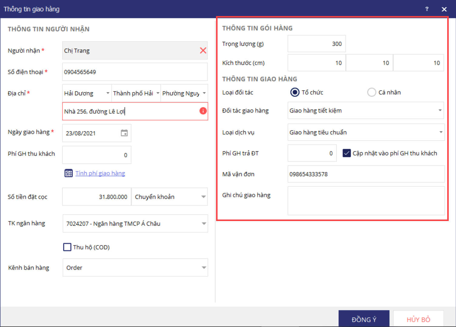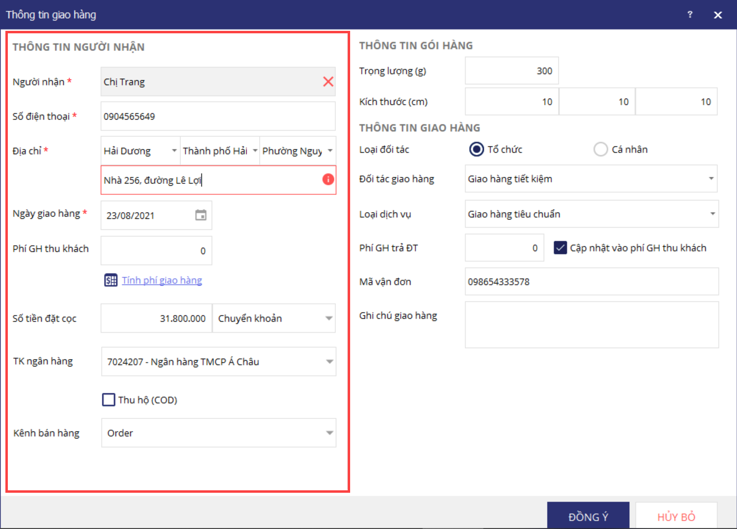 Trường hợp đối tác giao hàng thu tiền khách rồi chuyển về cho cửa hàng, tích chọn thông tin Thu hộ (COD).