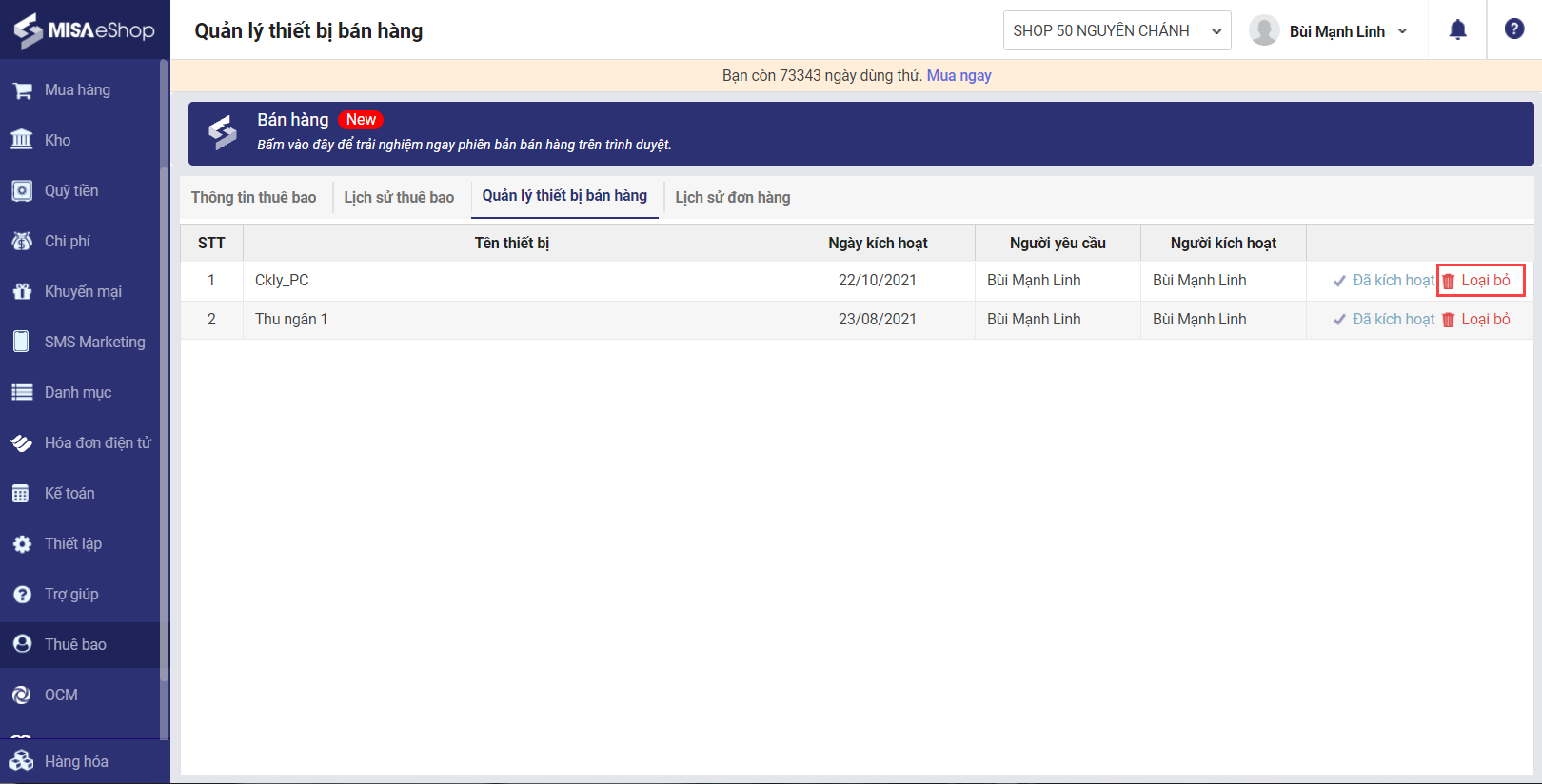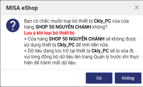 2. Nhấn Loại bỏ tương ứng với thông tin thiết bị thu ngân sử dụng trên máy cũ.