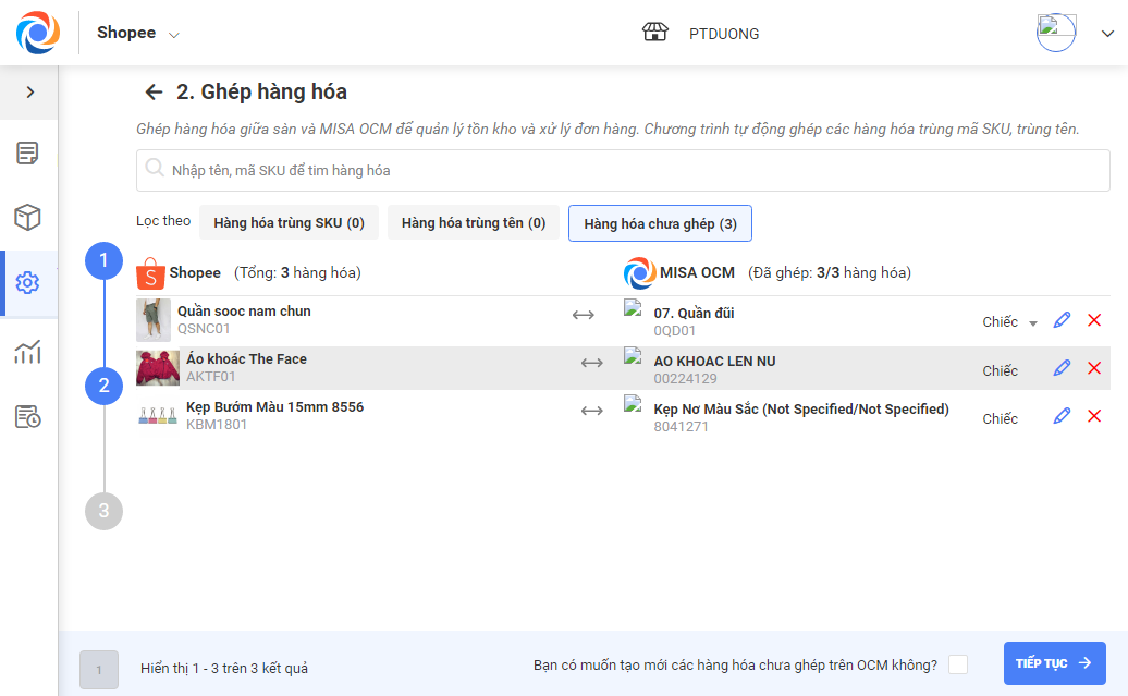 - Chương trình tự động liên kết hàng hóa trên sàn trùng tên, mã SKU với hàng hóa trên MISA eShop. Đối với những hàng hóa không tự động liên kết được giữa sàn và cửa hàng, quản lý vào tab Hàng hóa chưa ghép vàchọn hàng hóa liên kết phù hợp.