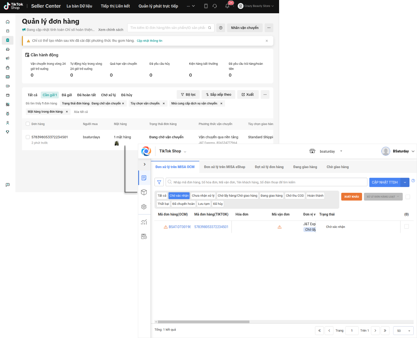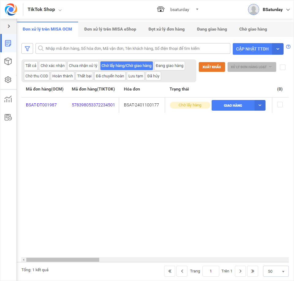 Sau khi chọn hình thức lấy hàng và xác nhận, đơn hàng sẽ được chuyển từ trạng thái Chưa nhận xử lý sang Chờ lấy hàng. Đồng thời cập nhật trạng thái đơn hàng trên TikTok Shop.