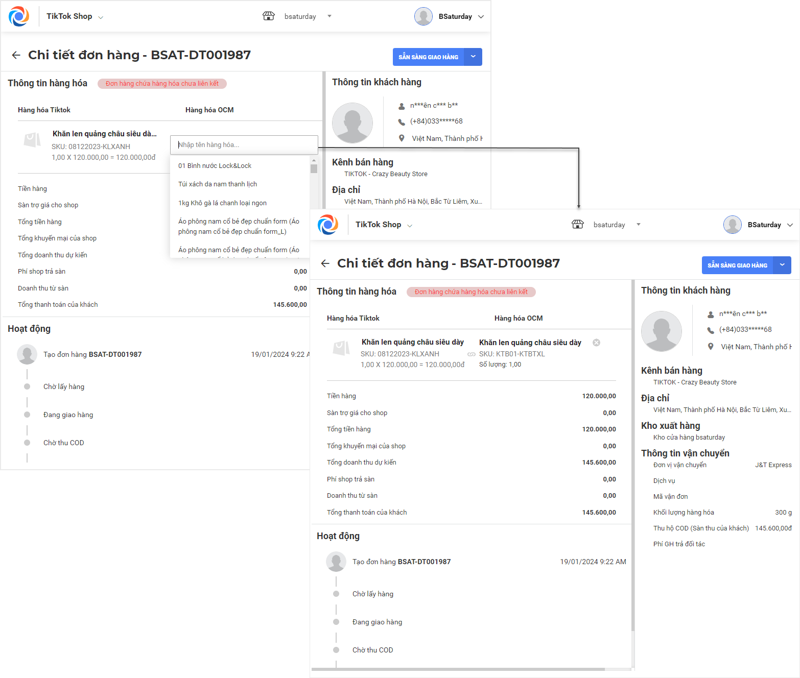 – Về thông tin khách hàng: Hiện tại, phần thông tin khách hàng bao gồm Tên, địa chỉ, số điện thoại của người mua TikTok Shop đang không công khai mà được hiển thị theo định dạng ***, chính vì thế Kênh cũng sẽ đồng bộ các phần thông tin đó giống trên Kênh người bán.