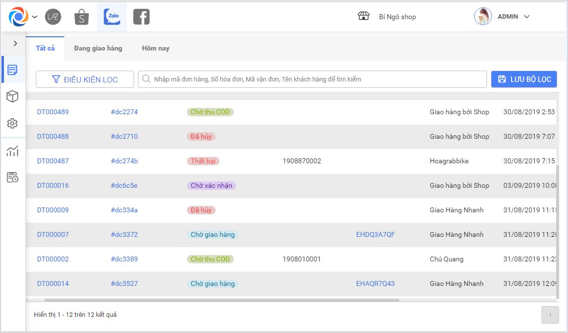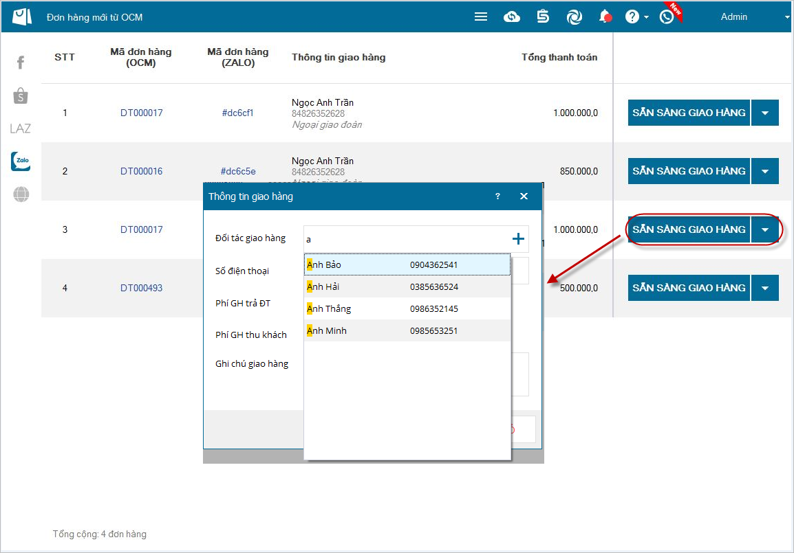 Giúp nhân viên bán hàng Online theo dõi trạng thái các đơn hàng từ Zalo: Chờ giao hàng, Đang giao hàng, Hoàn thành, Thất bại,…