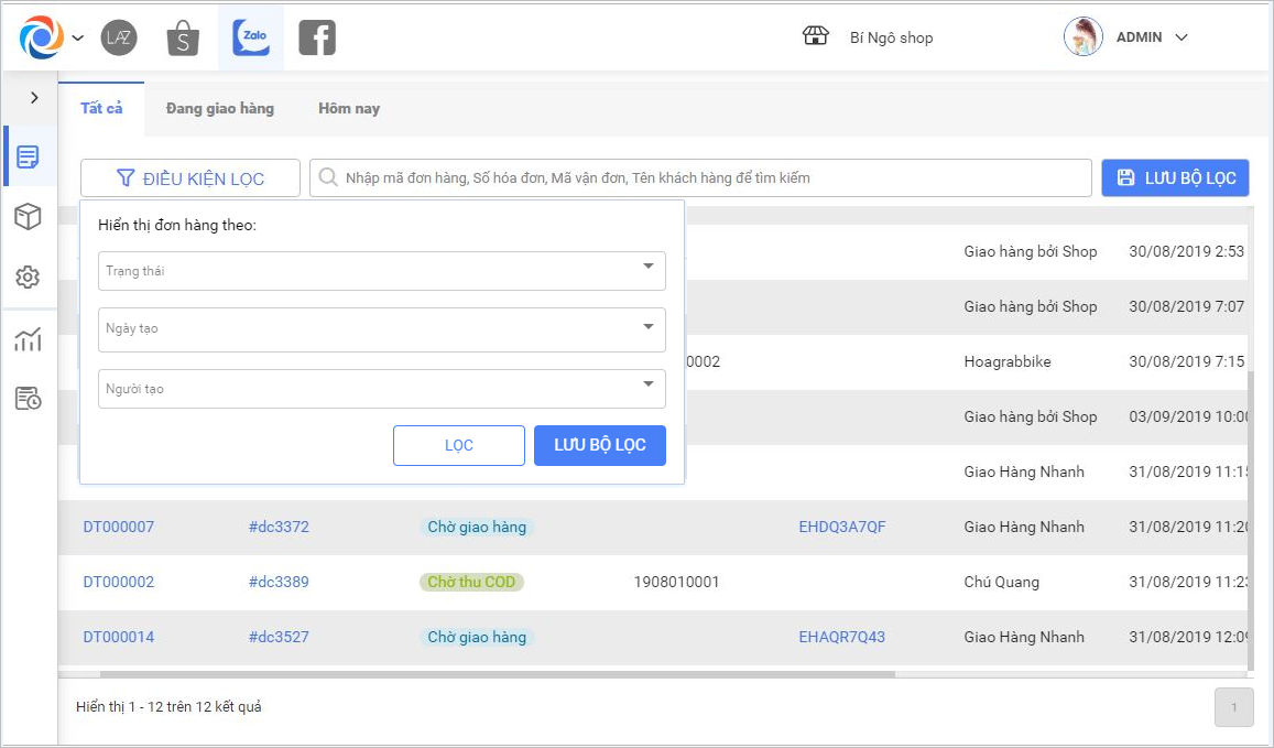 2. Lọc tìm đơn hàng
