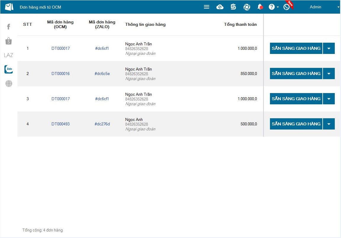 – Tại màn hình, chương trình đang hiển thị tất cả các đơn đặt hàng khách hàng đã đặt qua Zalo.