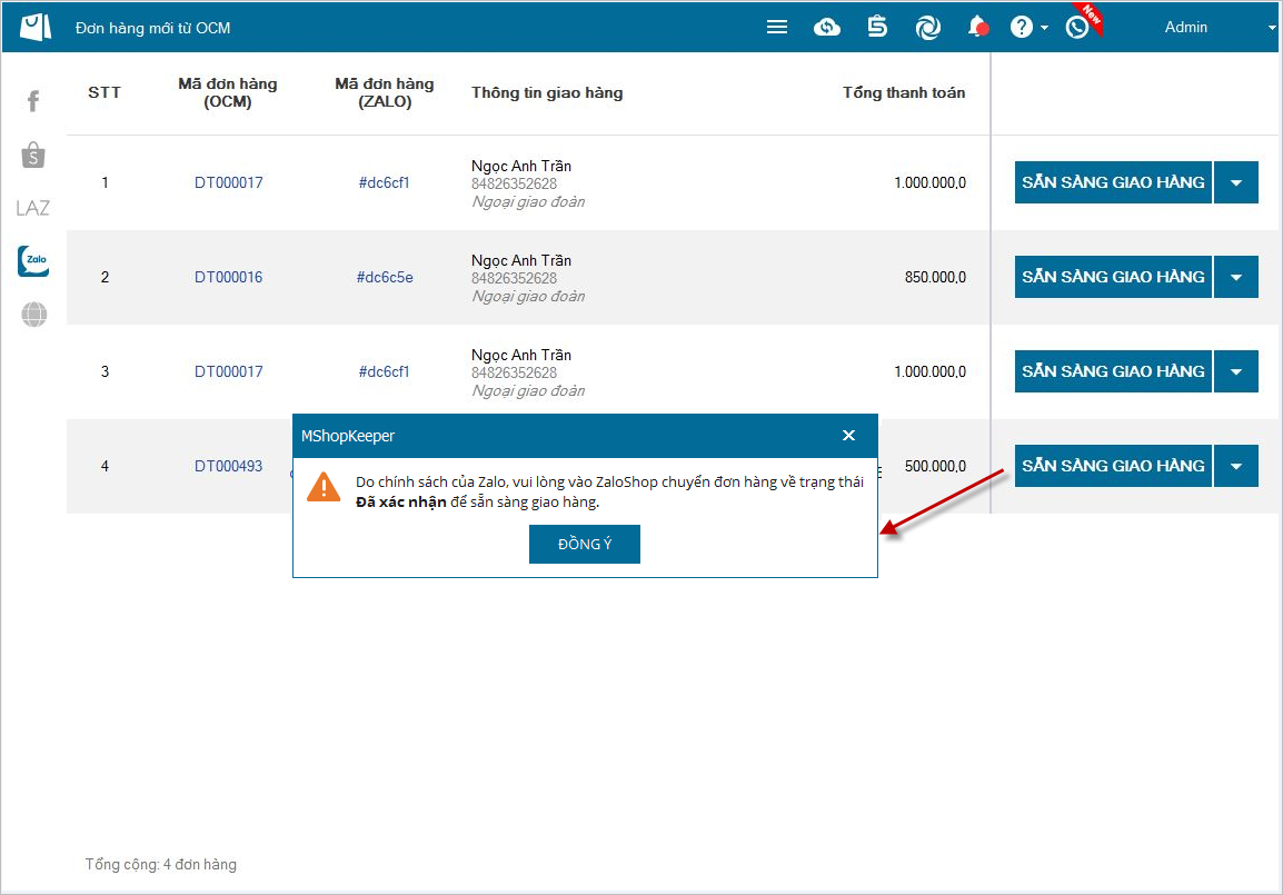 3.1 Xác nhận đơn hàng trên Zalo