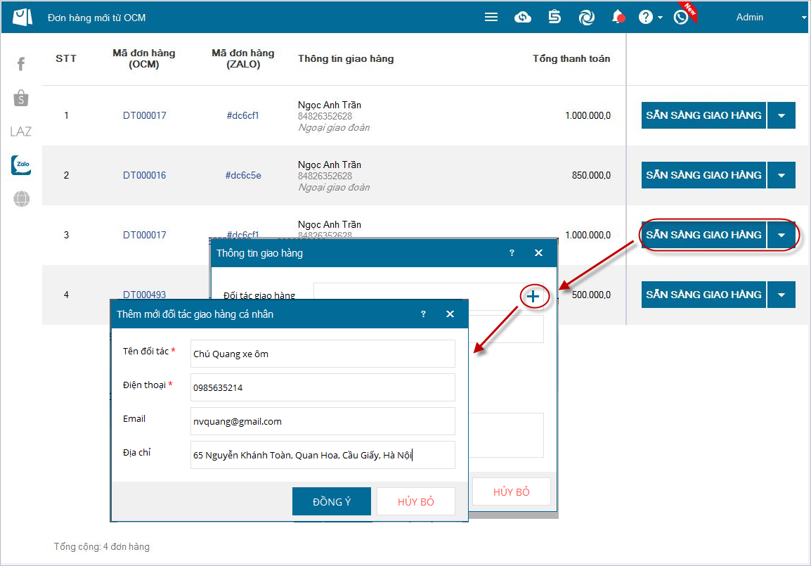 + Hoặc Thêm mới đối tác giao hàng.