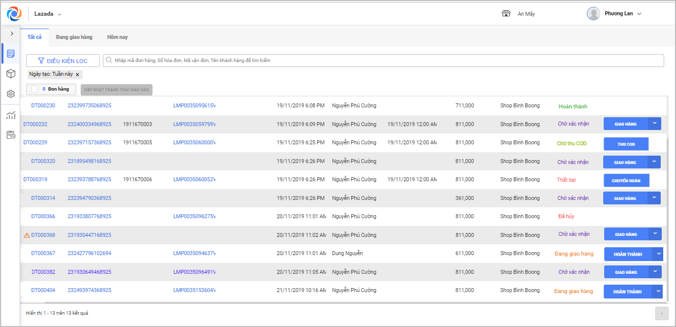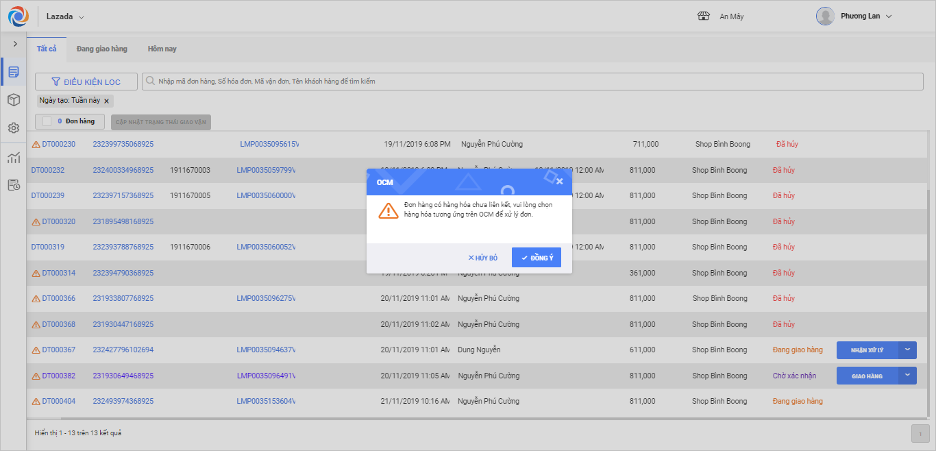 – Sau khi nhấn Giao hàng xong đơn hàng sẽ chuyển từ trạng thái Chờ xử lý thành Đang giao hàng và kể từ lúc này chương trình sẽ đồng bộ trạng thái đơn hàng từ trên Lazada về OCM để shop có thể theo dõi được trạng thái của từng đơn hàng