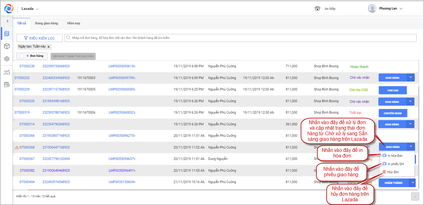 – Nhấn chọn Giao hàng để xử lý các đơn hàng có trạng thái Chờ xác nhận, đơn hàng sẽ được chuyển từ trạng thái Chờ xác nhận thành Đang giao hàng đồng thời cập nhật trạng thái đơn hàng vừa được xác nhận trên Lazada từ Chờ xử lý sang Sẵn sàng giao hàng. Nhấn Hủy đơn để hủy đơn hàng trên Lazada.