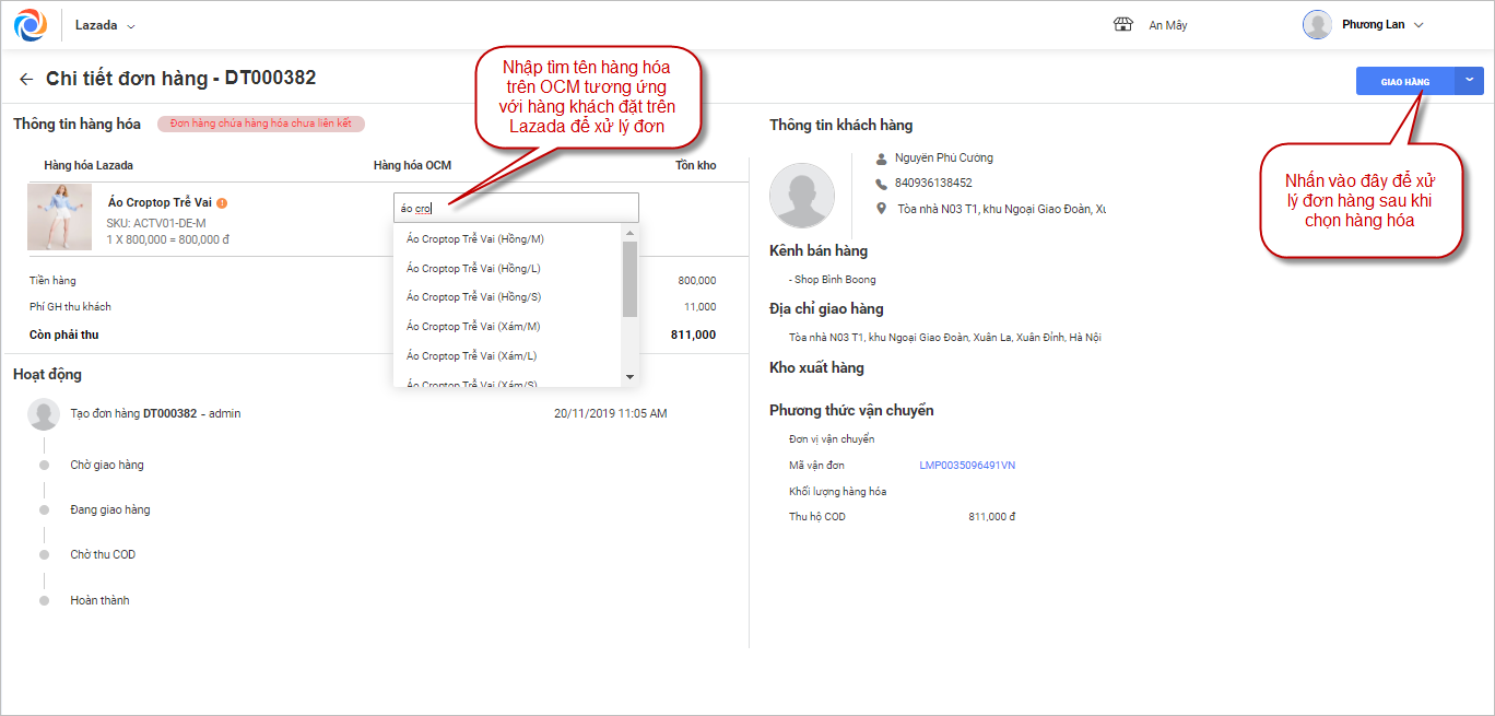 – Nhấn Đồng ý,chương trình sẽ hiển thị màn hình chi tiết đơn hàng, để tiếp tục xử lý đơn hàng shop cần chọn hàng hóa trên OCM tương ứng với hàng hóa khách đã đặt trên Lazada sau đó nhấn lại Giao hàng để tiếp tục xử lý đơn