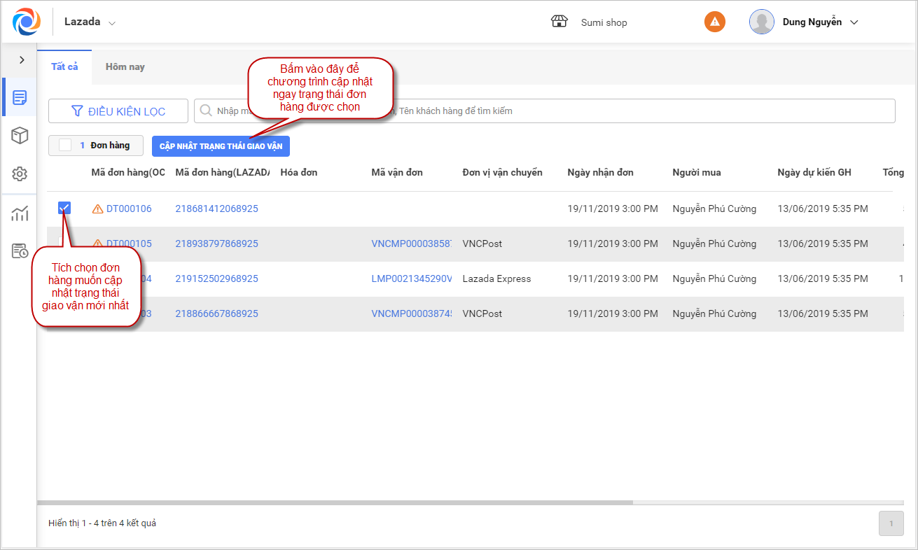 Trong TH chương trình chưa đồng bộ kịp thời trạng thái từ Lazada về OCM, tích chọn vào đơn hàng shop muốn cập nhật trạng thái và bấm Cập nhật trạng thái giao vận trên OCM để có được trạng thái đơn hàng mới nhất từ Lazada