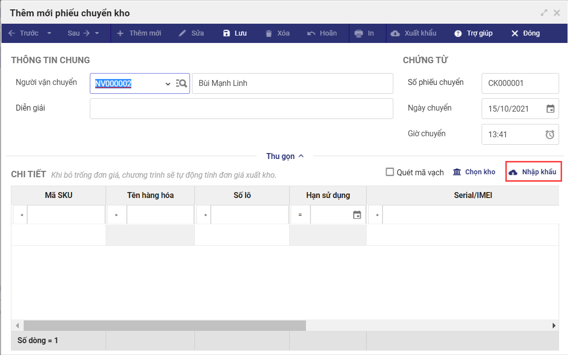 - Trên màn hình Thêm mới phiếu chuyển kho, nhấn Nhập khẩu.