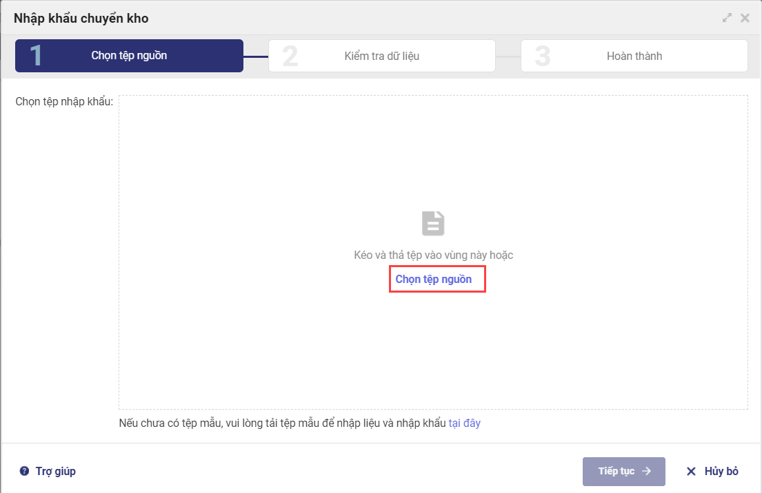 - Nhấn Chọn tệp nguồn để tải lên file excel đã chuẩn bị trước.