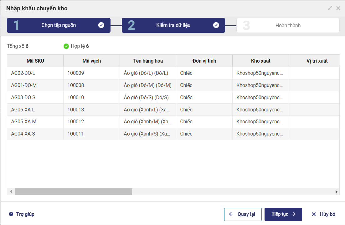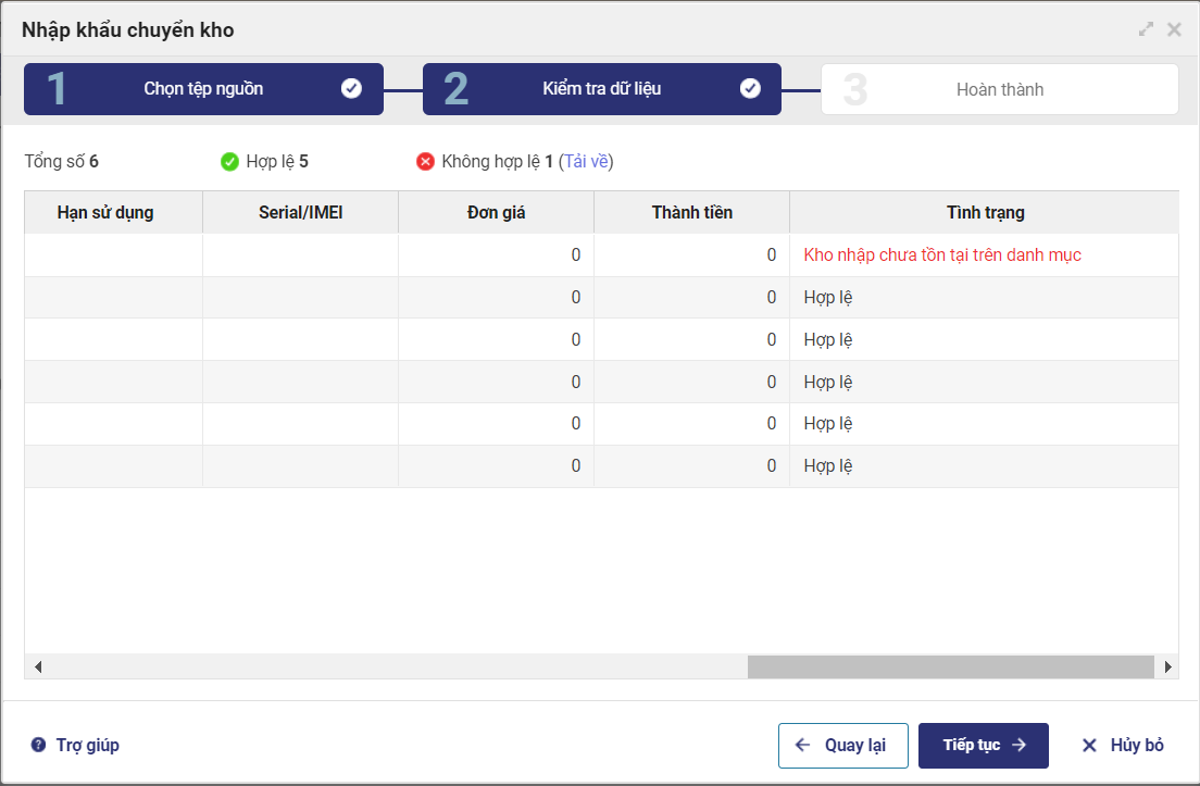 - Nhấn Tiếp tục để nhập khẩu các hàng hóa hợp lệ hoặc sửa lại tình trạng lỗi để nhập khẩu lại.
