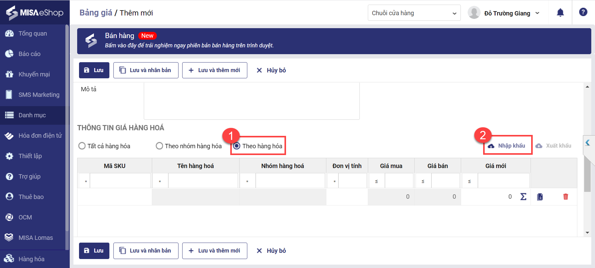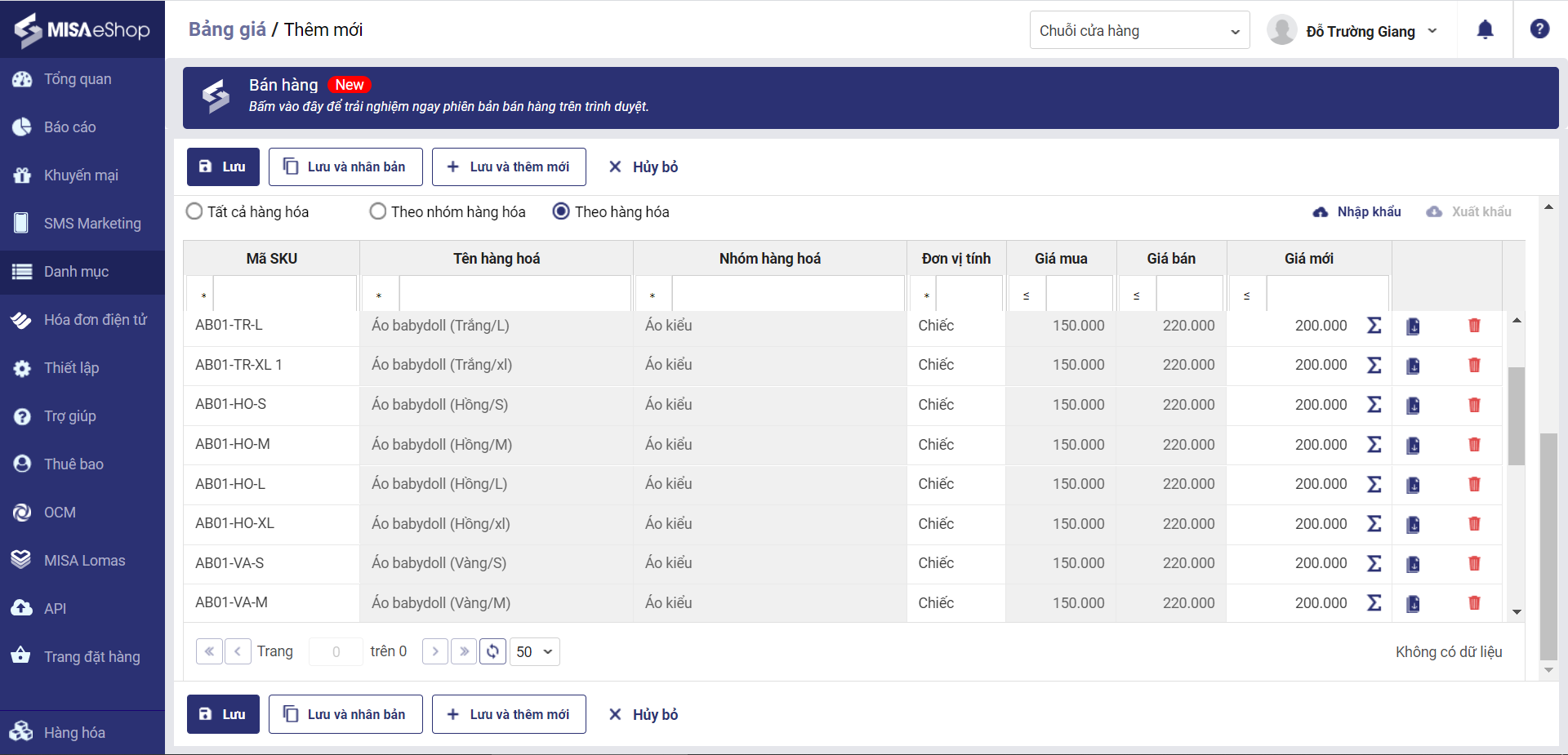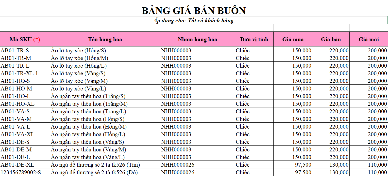 Tại một số cửa hàng có áp dụng cả 2 hình thức bán buôn và bán lẻ. Với hình thức bán buôn, chủ cửa hàng áp dụng 1 bảng giá riêng và quản lý trên file excel. Quản lý có thể nhập khẩu bảng giá bán buôn vào chương trình theo hướng dẫn sau: