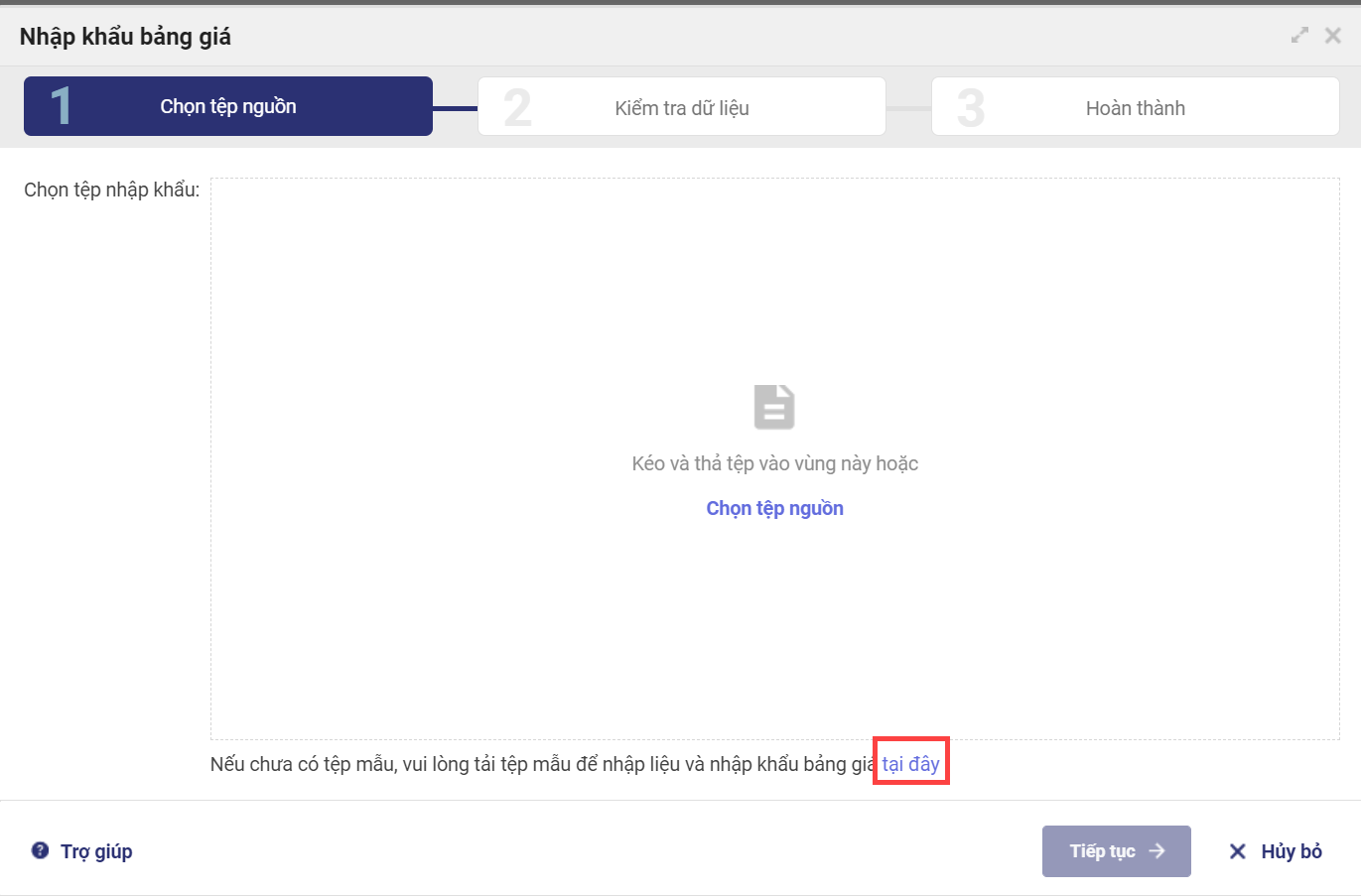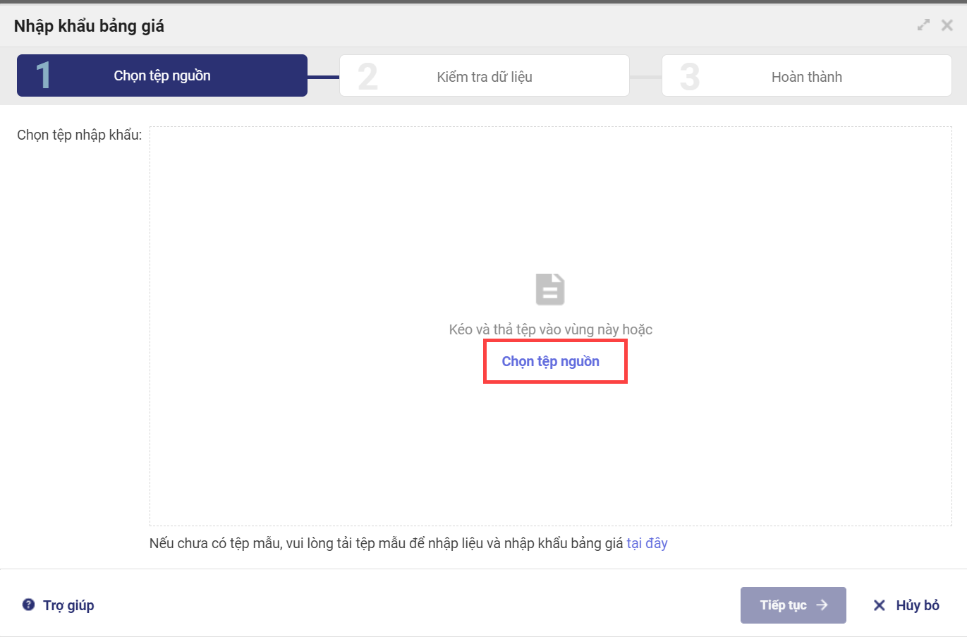 - Tại màn hình Nhập khẩu bảng giá, nhấn Chọn tệp nguồn để tải lên file excel vừa thiết lập.