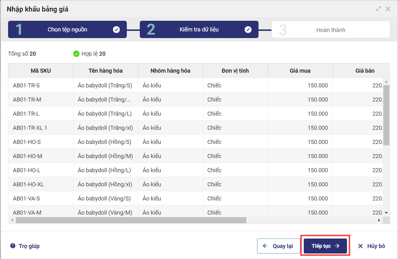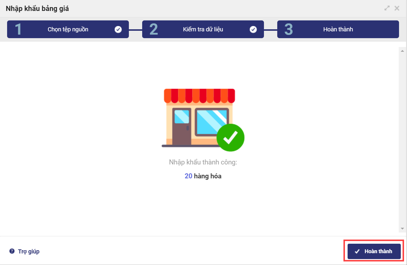 - Nhấn Hoàn thành. Khi đó, danh sách hàng hóa đã được tải lên chương trình.