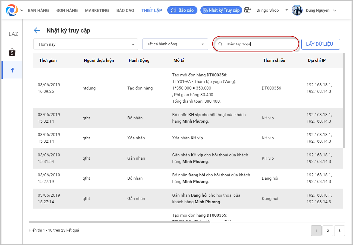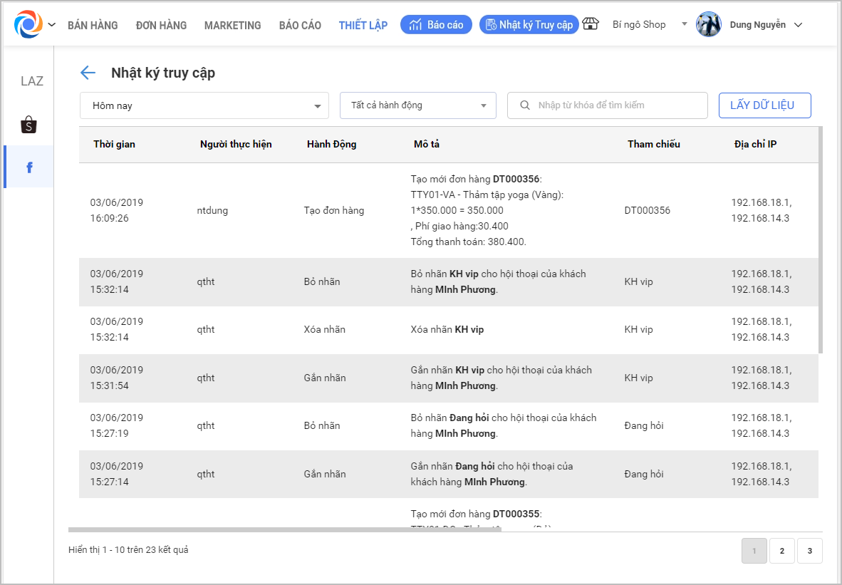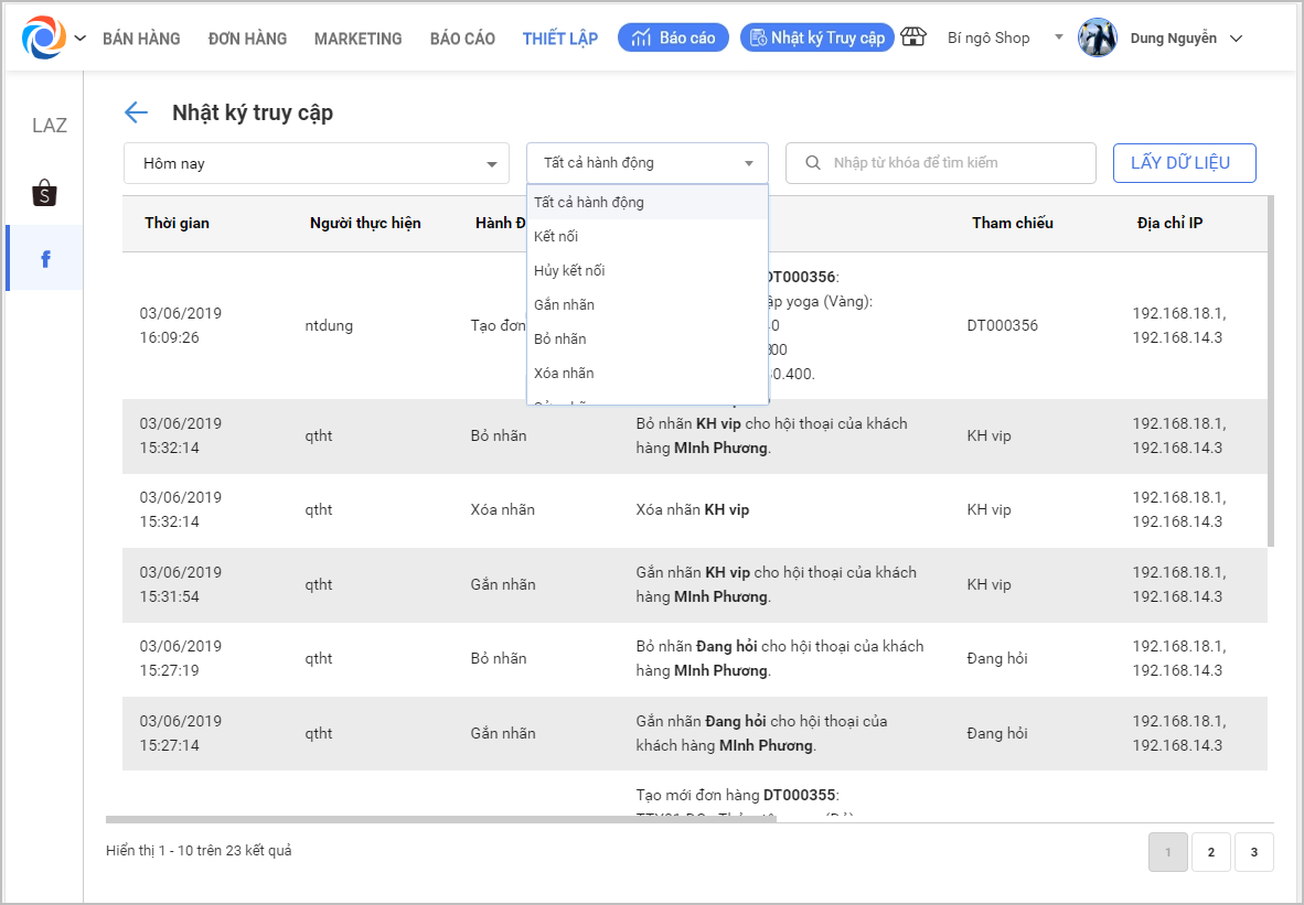 – Chọn các hành động để xem nhật ký truy cập
