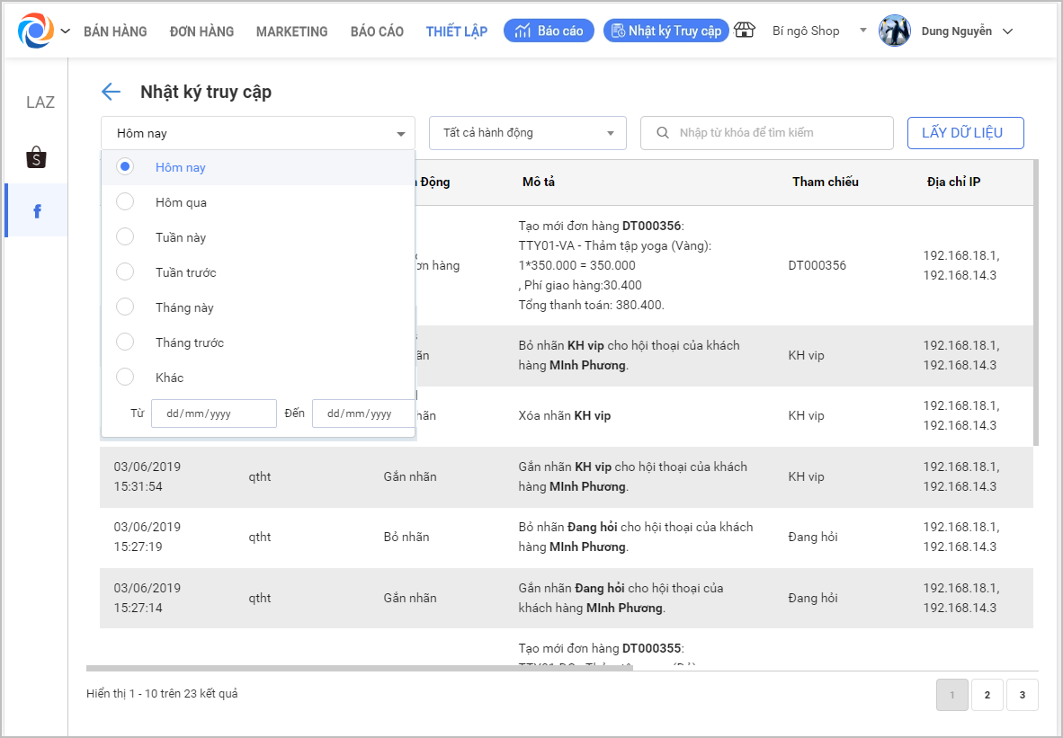 – Có thể chọn khoảng thời gian để xem Nhật ký truy cập