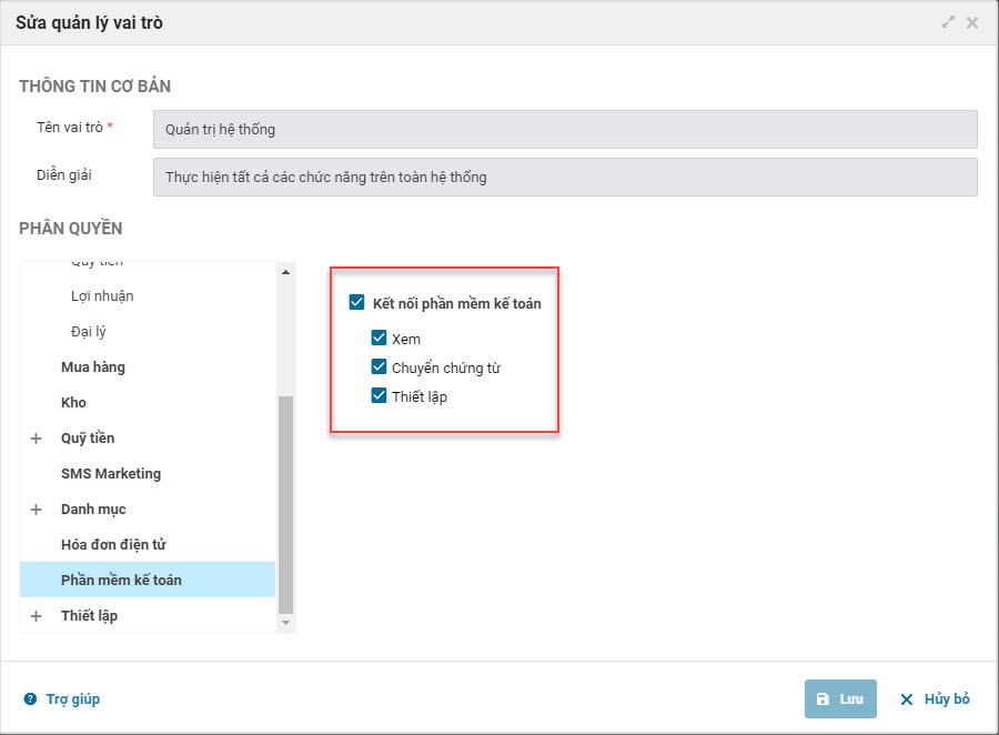 Vào Thiết lập chọn chức năng Quản lý vai trò, chọn sửa quản lý vai trò, chọn mục Phần mềm kế toán thực hiện phân quyền.