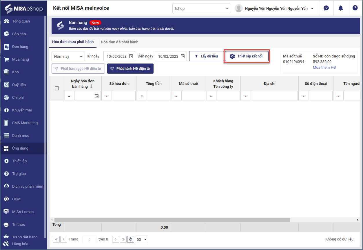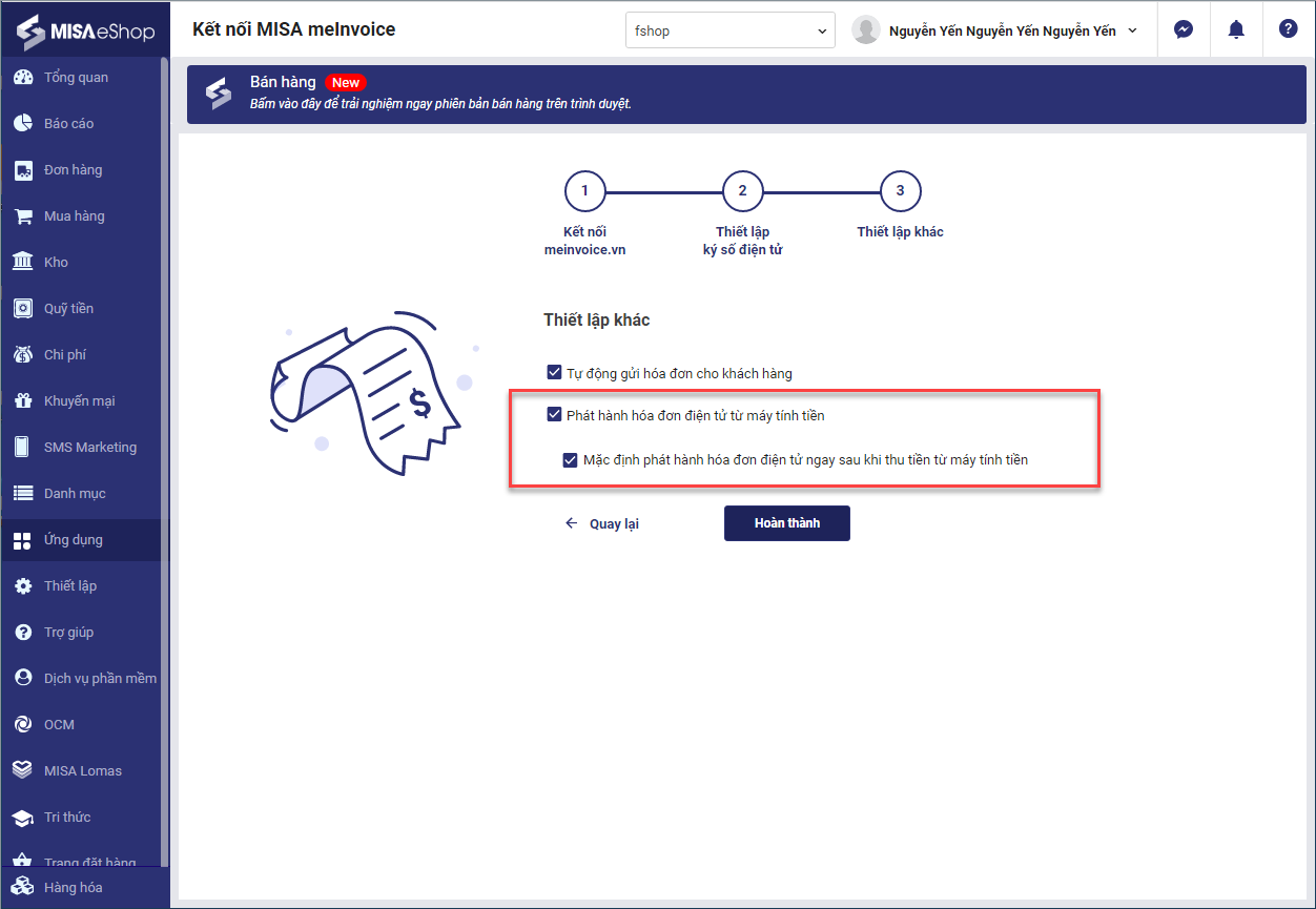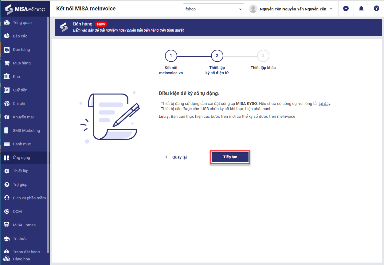 ớc 2: Cửa hàng đã thực hiện kết nối phần mềm MShopKeeper và MISA meInvoice.