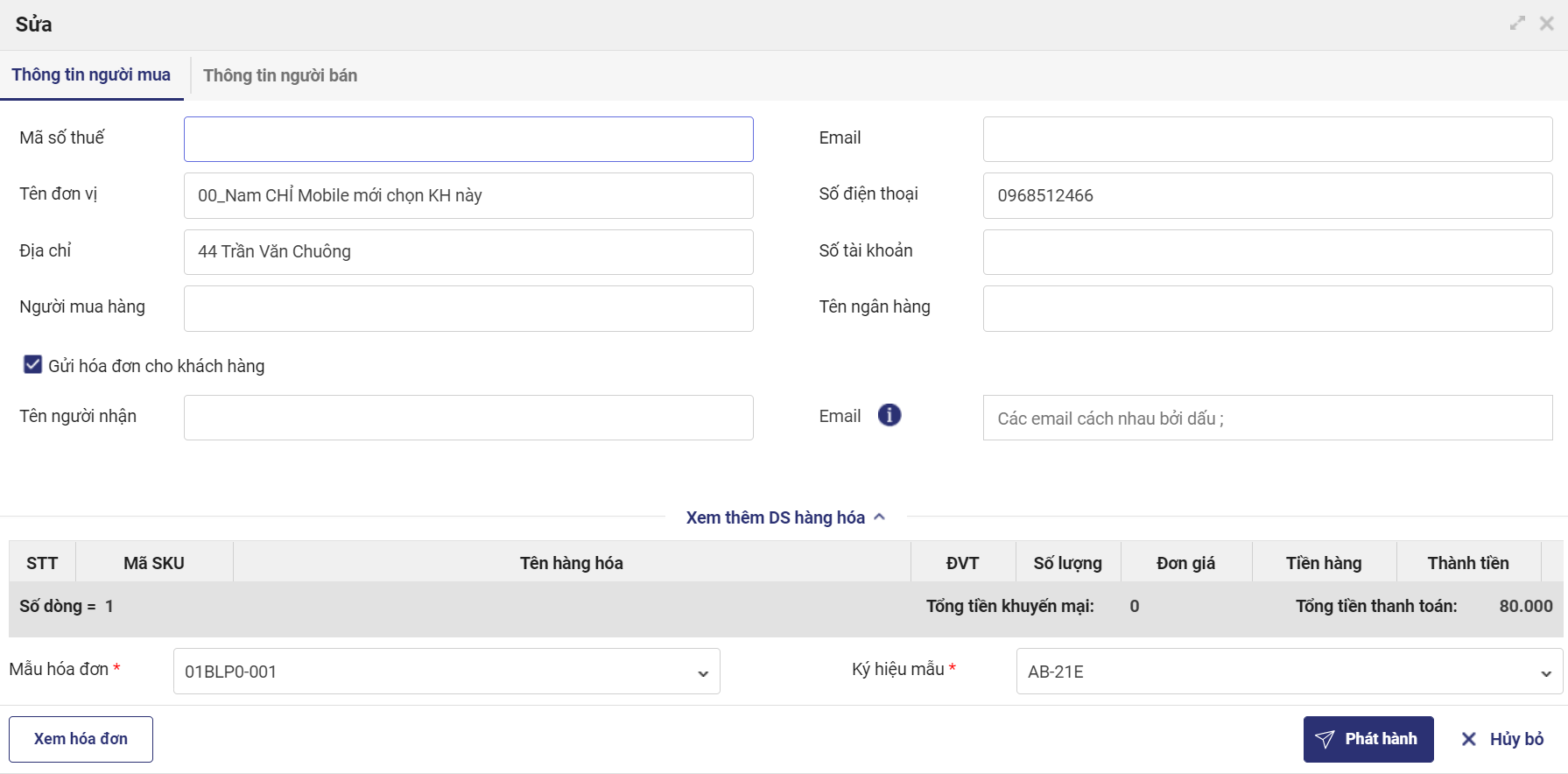 - Đối với hóa đơn chưa có thông tin người nhận, kế toán nhấn biểu tượng