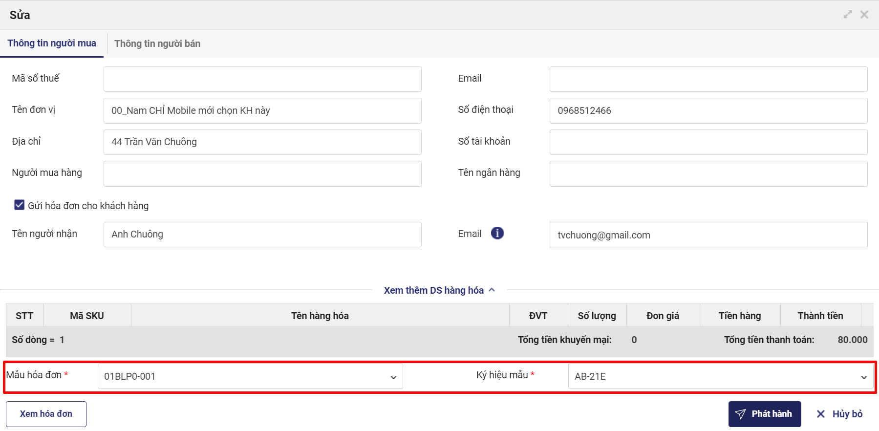 để nhập thông tin mã số thuế, tên đơn vị, tên người nhận, email của người nhận và chọn mẫu hóa đơn, ký hiệu mẫu.