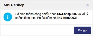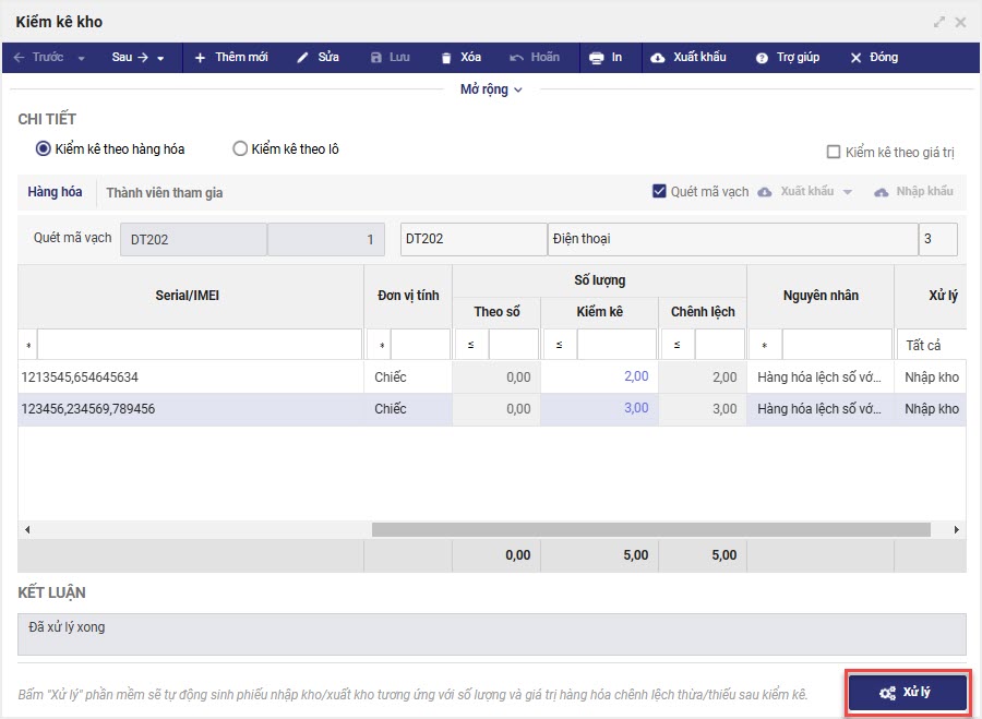 Bước 8: Sau khi đối chiếu và xác nhận thông tin kiểm kê, nhấn Xử lý, tức thời phần mềm sẽ tự động sinh phiếu nhập kho/xuất kho tương ứng với số lượng và giá trị hàng hóa chênh lệch thừa thiếu khi khi kiểm kê