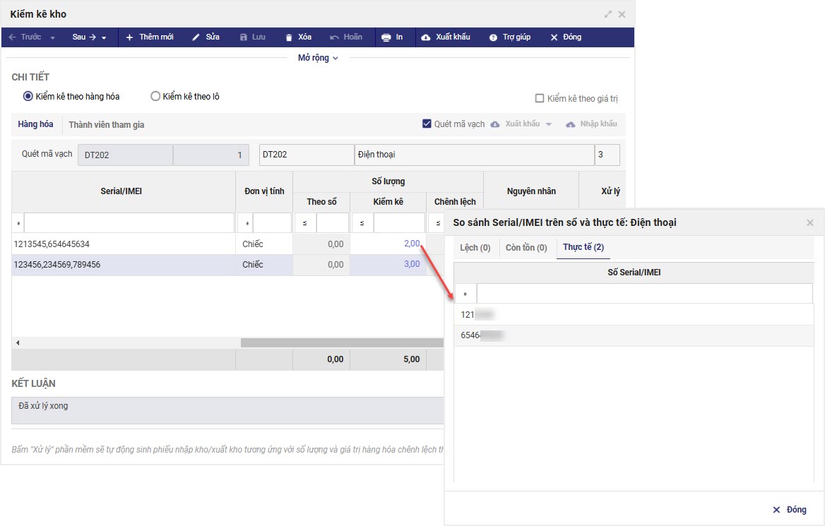 Để so sánh Serial/IMEI của hàng hóa trên sổ so với thực tế, nhấn vào ô số lượng tại cột Kiểm kê của từng dòng hàng hóa. Chương trình sẽ hiển thị thông tin Serial/IMEI tồn trên sổ, Serial/IMEI kiểm kê thực tế, Serial/IMEI lệch của hàng hóa để kiểm tra chi tiết