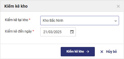 Bước 2: Nhấn Thêm mới phiếu kiểm kê kho, chọn kho cần kiểm kê và ngày kiểm kê. Sau đó, nhấn Kiểm kê kho để tạo phiếu kiểm kê