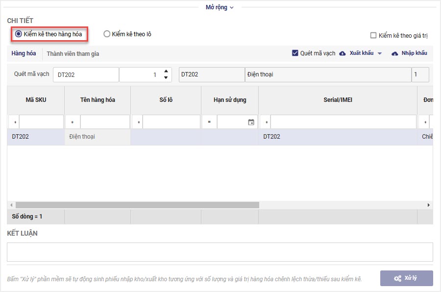 Bước 4: Tích chọn Kiểm kê theo hàng hóa và chọn hàng hóa quản lý theo Serial/IMEI vào phiếu kiểm kê bằng cách nhập mã SKU hoặc quét mã serial/IMEI của hàng hóa vào phiếu