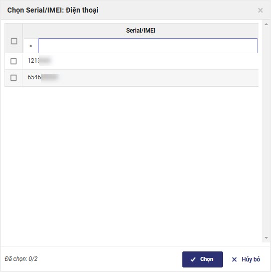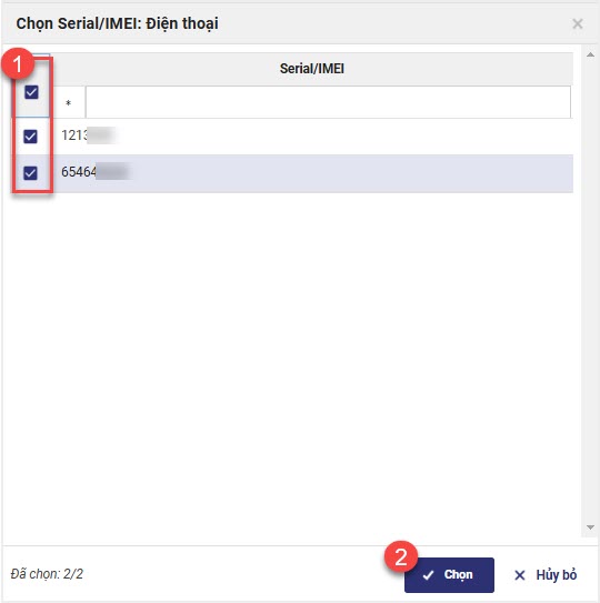 Bước 6: Tích chọn những Serial/IMEI muốn thêm vào phiếu, sau đó nhấn Chọn