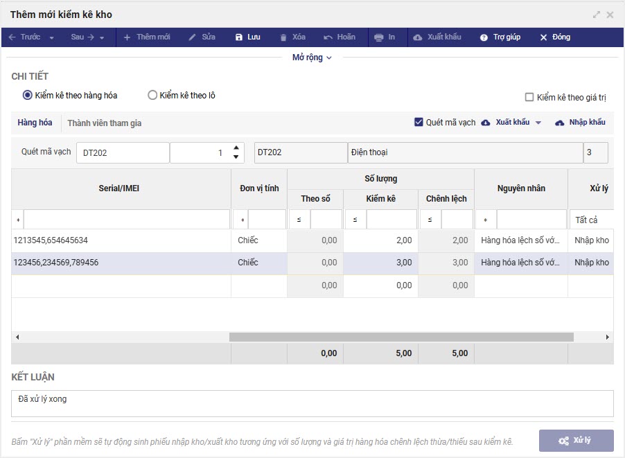 Hướng dẫn chi tiết cách thực hiện kiểm kê kho hàng hóa quản lý theo Serial/IMEI, đảm bảo tính chính xác giữa số lượng tồn kho trên sổ và thực tế
