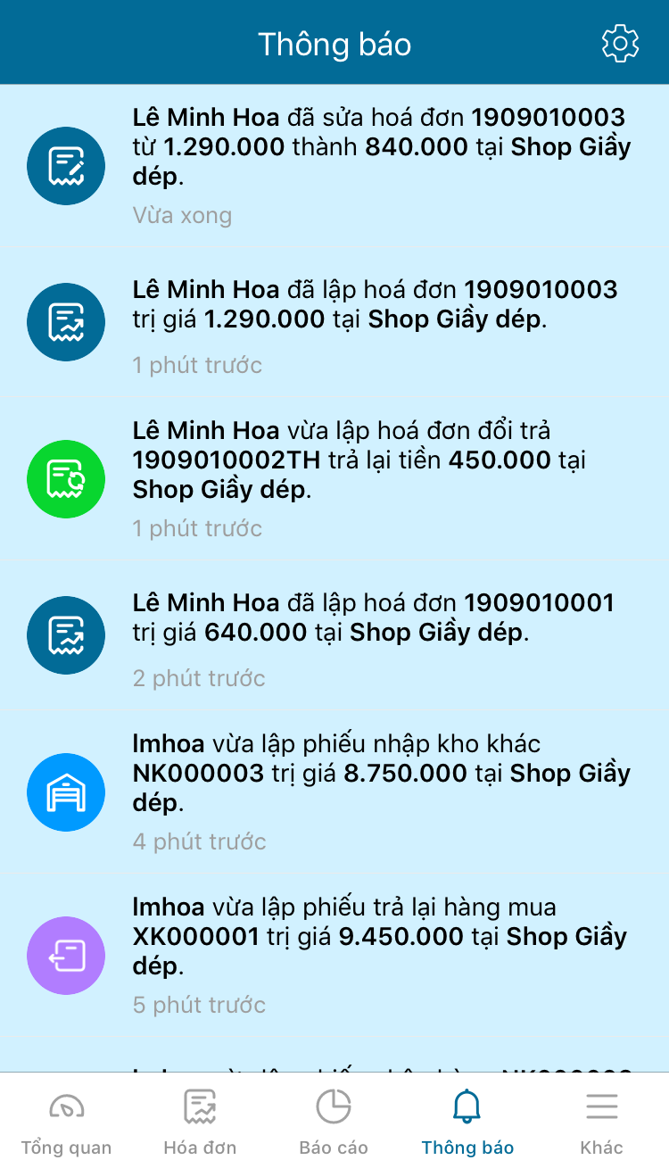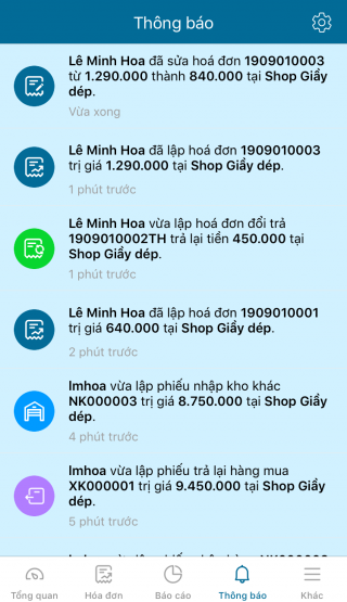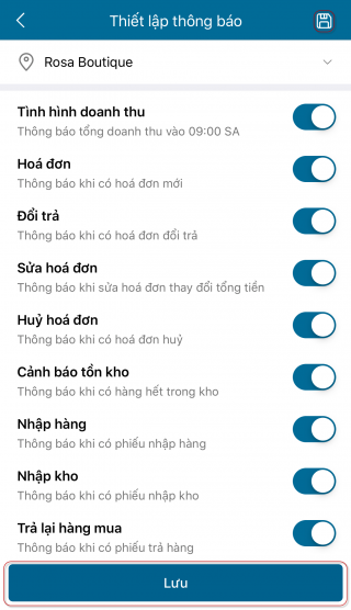 Quản lý muốn nhận được thông báo về hoạt động bán hàng (tình hình doanh thu, hóa đơn mới, hóa đơn đổi trả mới, sửa hóa đơn, hủy hóa đơn), mua hàng (phiếu nhập hàng mới, phiếu trả lại hàng mua mới), kho (nhập kho, tồn kho) thì thực hiện thiết lập theo các bước sau đây: