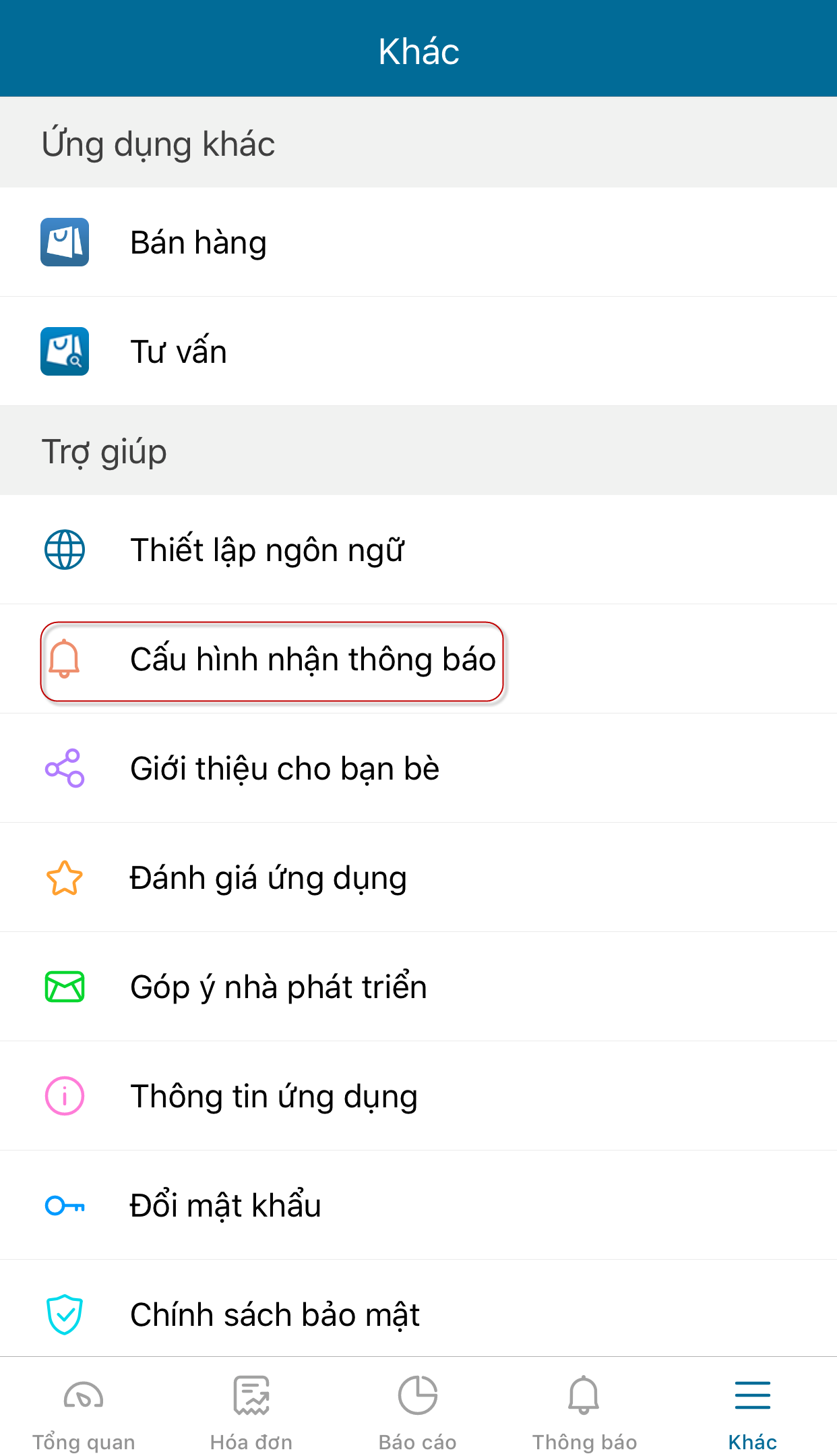 1. Chọn tab Khác/Chọn Cấu hình nhận thông báo