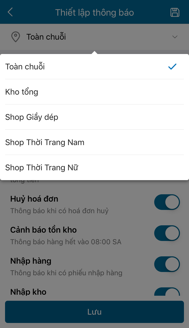 3. Với chuỗi cửa hàng, Quản lý có thể chọn thiết lập thông báo cho từng cửa hàng trong chuỗi hoặc thiết lập thông báo cho toàn chuỗi