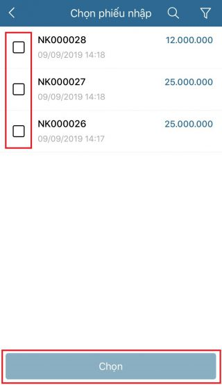 - Danh sách phiếu nhập hàng , chọn phiếu hàng muốn đổi trả và ấn chọn .