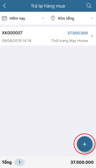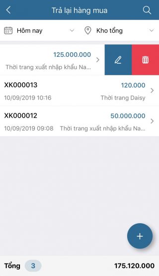 3. Để sửa, xóa phiếu trả lại hàng mua thì trên danh sách chọn phiếu, vuốt sang trái và chạm vào biểu tượng