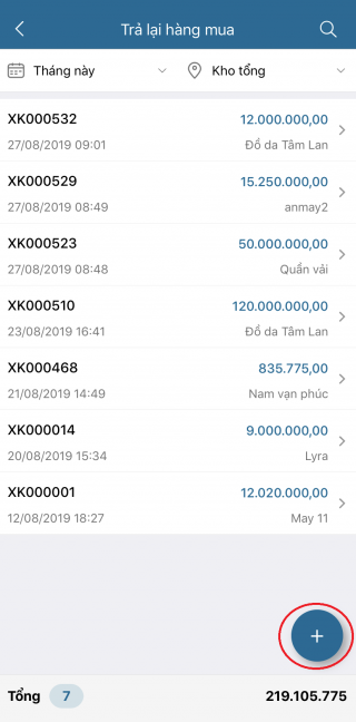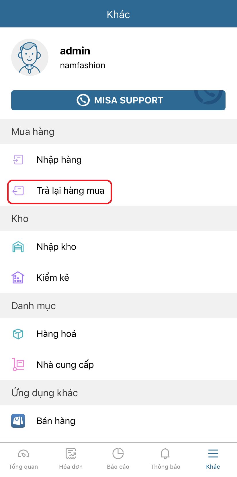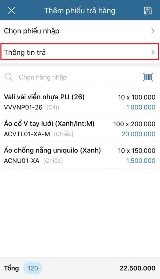 - Chọn tab Khác / Trả lại hàng mua .