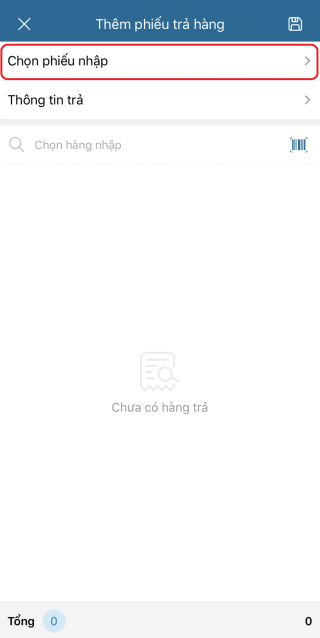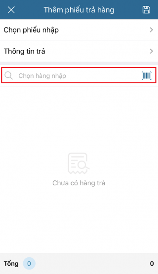 - Chọn vào Chọn hàng nhập hoặc chạm vào biểu tượng để quét mã vạch tìm hàng hóa.
